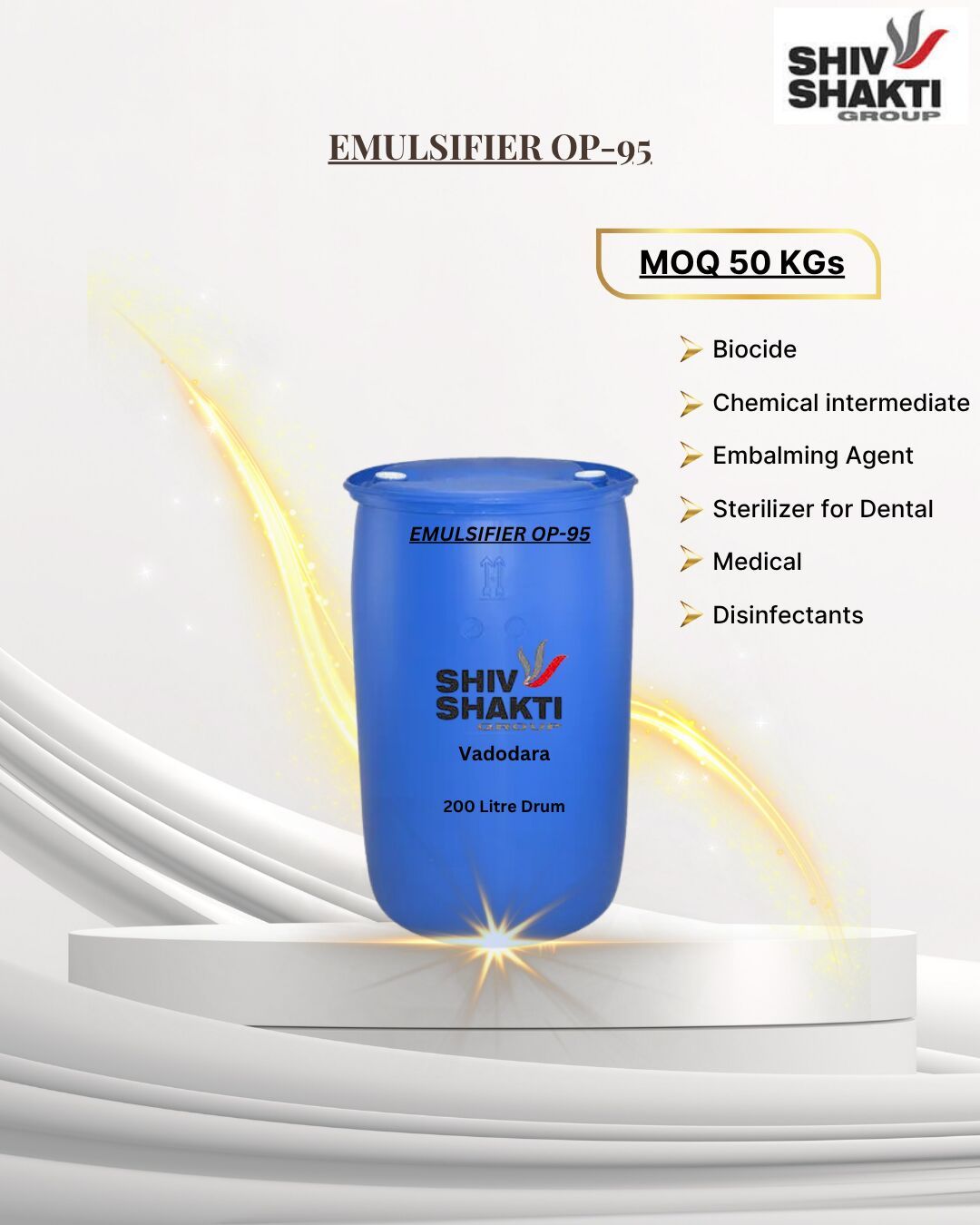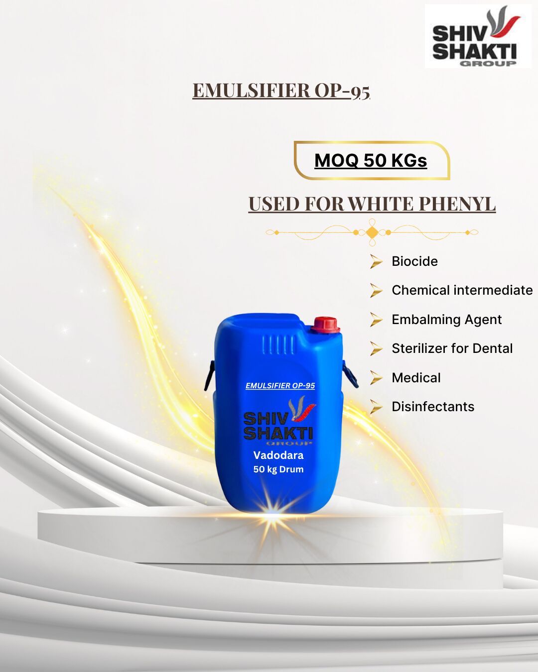 Used for making Pine oil Water soluble, Emulsifier OP-95 is sold like a hot cake. Its characteristic quality prevents layer separation in White Phenyle.