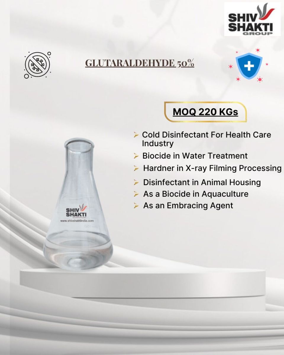 We are offering gluteraldehyde 50% c.a.s no. 111-30-8 einecs no. 203-856-5 chemical formula c5h8o2 appearance clear to yellowish liquid content 50% min boiling point 187oc melting point -14oc sp.gr at 25+- 2deg c 1.01 ~1.02 solubility in water soluble use biocide chemical intermediate to synthesize other compounds disinfectant ( health industry, animal housing) embalming agent fixative in leather tanning ; biological tissues hardener in x ray film processing sterilizer for medical equipments dental equipments.